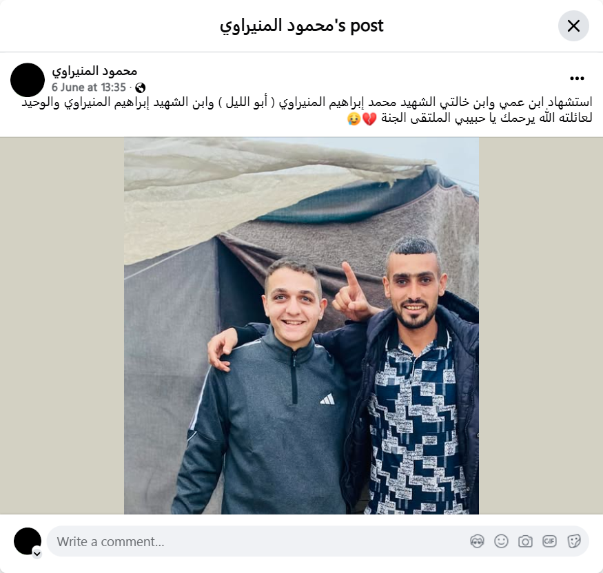 The martyrdom of my cousin and aunt, the martyr Muhammad Ibrahim Al-Munirawi (Abu Al-Layl), the son of the martyr Ibrahim Al-Munirawi and the only one in his family. May God have mercy on you, my beloved. The meeting place is Paradise.