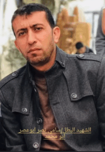 Shocking news, I bring you the news of the martyrdom of my uncle Sami Nasr Abu Asr. Goodbye, uncle. Goodbye, dear of our hearts. Goodbye, dear Musk Fayeh. You asked for it and got it, uncle. It is not a loss. By God, grant peace to your son Muhammad and peace to my uncle Sharif. Our martyred hero: Sami Nasr Abu Asr (Abu Muhammad)