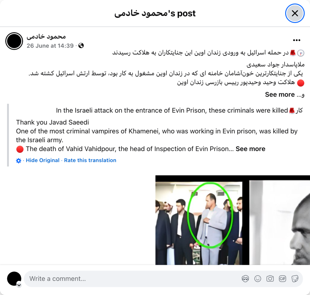 In the Israeli attack on the entrance of Evin Prison, these criminals were killed Thank you Javad Saeedi One of the most criminal vampires of Khamenei, who was working in Evin prison, was killed by the Israeli army. The death of Vahid Vahidpour, the head of Inspection of Evin Prison… See more In the Israeli attack on the entrance of Evin Prison, these criminals were killed Thank you Javad Saeedi One of the most criminal vampires of Khamenei, who was working in Evin prison, was killed by the Israeli army. The death of Vahid Vahidpour, the head of Inspection of Evin Prison… See more · Hide Original · Rate this translation