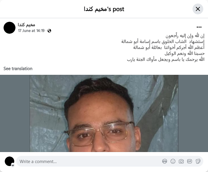 The martyrdom of the honorable young man, Osama Abu Shamala. May God reward you greatly, our sisters in the Abu Shamala family.