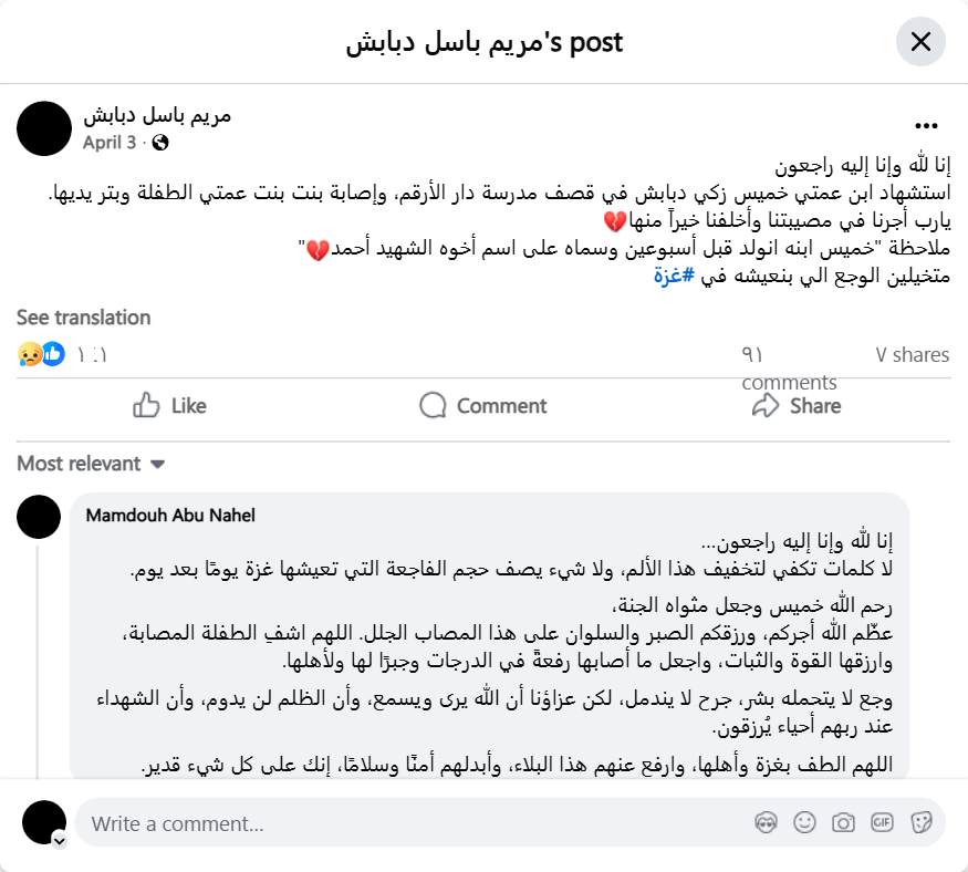 استشهاد ابن عمتي خميس زكي دبابش في قصف مدرسة دار الأرقم، وإصابة بنت بنت عمتي الطفلة وبتر يديها.