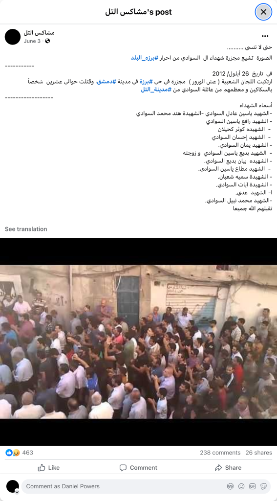 Lest we forget.......... The photo shows the massacre of the Al-Sawadi martyrs from the free people of #Barzeh_Al-Balad ---------- On September 26, 2012, the popular committees (Esh Al-Warwar) committed a massacre in the neighborhood of #Barzeh in the city of #Damascus, and killed about twenty people with knives, most of them from the Al-Sawadi family from the city of #Al-Tall ------------------ Names of the martyrs - Martyr Yassin Adel Al-Sawadi - Martyr Hind Muhammad Al-Sawadi - Martyr Rafi Yassin Al-Sawadi - Martyr Kawthar Kuhailan - Martyr Ihsan Al-Sawadi - Martyr Yaman Al-Sawadi. - Martyr Badih Yassin Al-Sawadi and his wife - Martyr Bayan Badih Al-Sawadi. - Martyr Mutaa Yassin Al-Sawadi. - Martyr Samia Shaaban. - Martyr Ayat Al-Sawadi. A- Martyr Uday. - Martyr Muhammad Nabil Al-Sawadi. May Allah accept them all