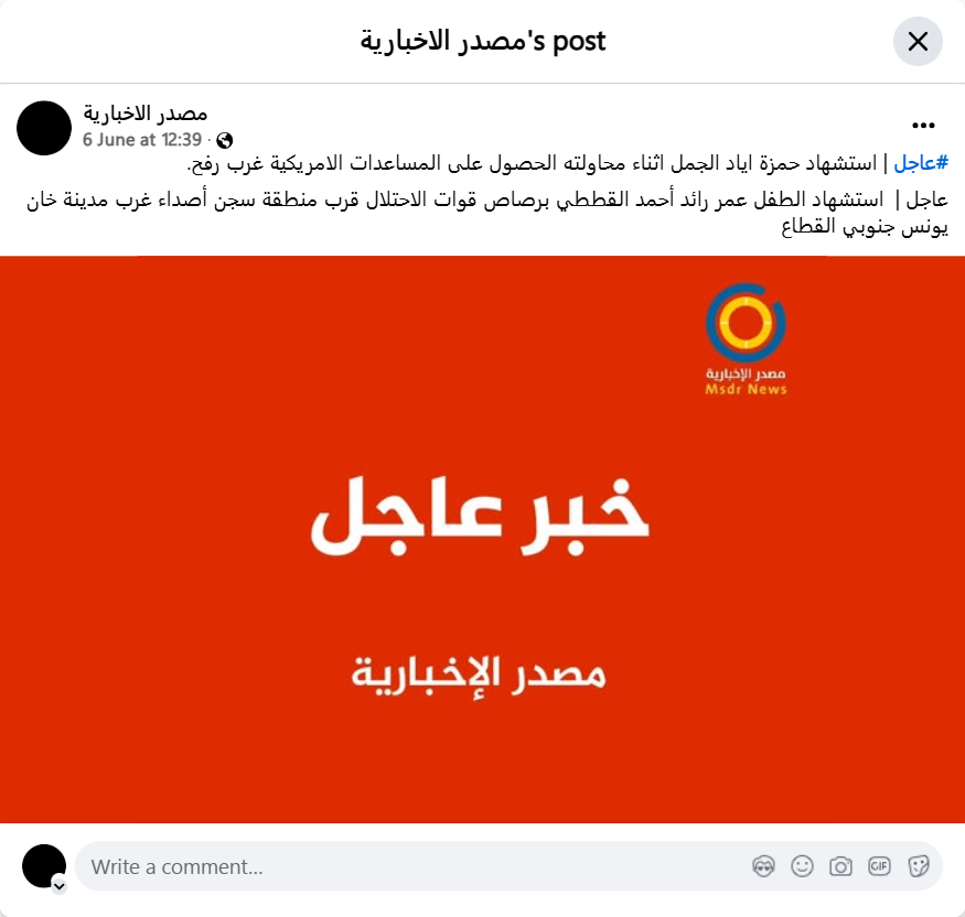#Urgent | Hamza Iyad Al-Jamal was martyred while trying to obtain American aid west of Rafah.