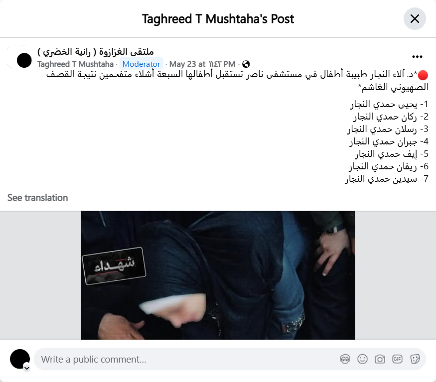 *Dr. Alaa Al-Najjar, a pediatrician at Nasser Hospital, receives her seven children, charred remains, as a result of the brutal Zionist bombing* 1- Yahya Hamdi Al-Najjar 2- Rakan Hamdi Al-Najjar 3- Raslan Hamdi Al-Najjar 4- Gebran Hamdi Al-Najjar 5- Eve Hamdi Al-Najjar 6- Revan Hamdi Al-Najjar 7- Sayedin Hamdi Al-Najjar