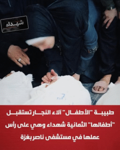 *د. آلاء النجار طبيبة أطفال في مستشفى ناصر تستقبل أطفالها السبعة أشلاء متفحمين نتيجة القصف الصهيوني الغاشم*