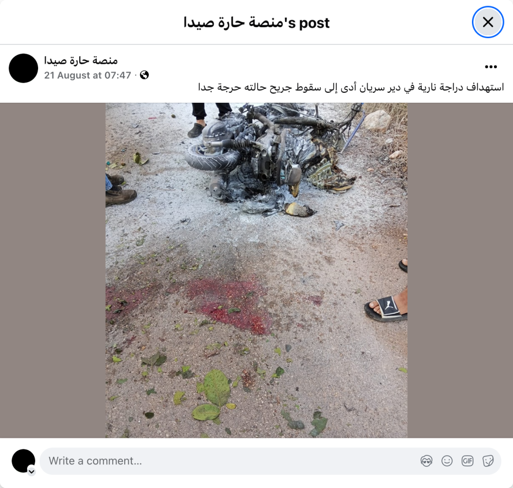 A motorcycle was targeted in Deir Siryan, leaving one person in critical condition.