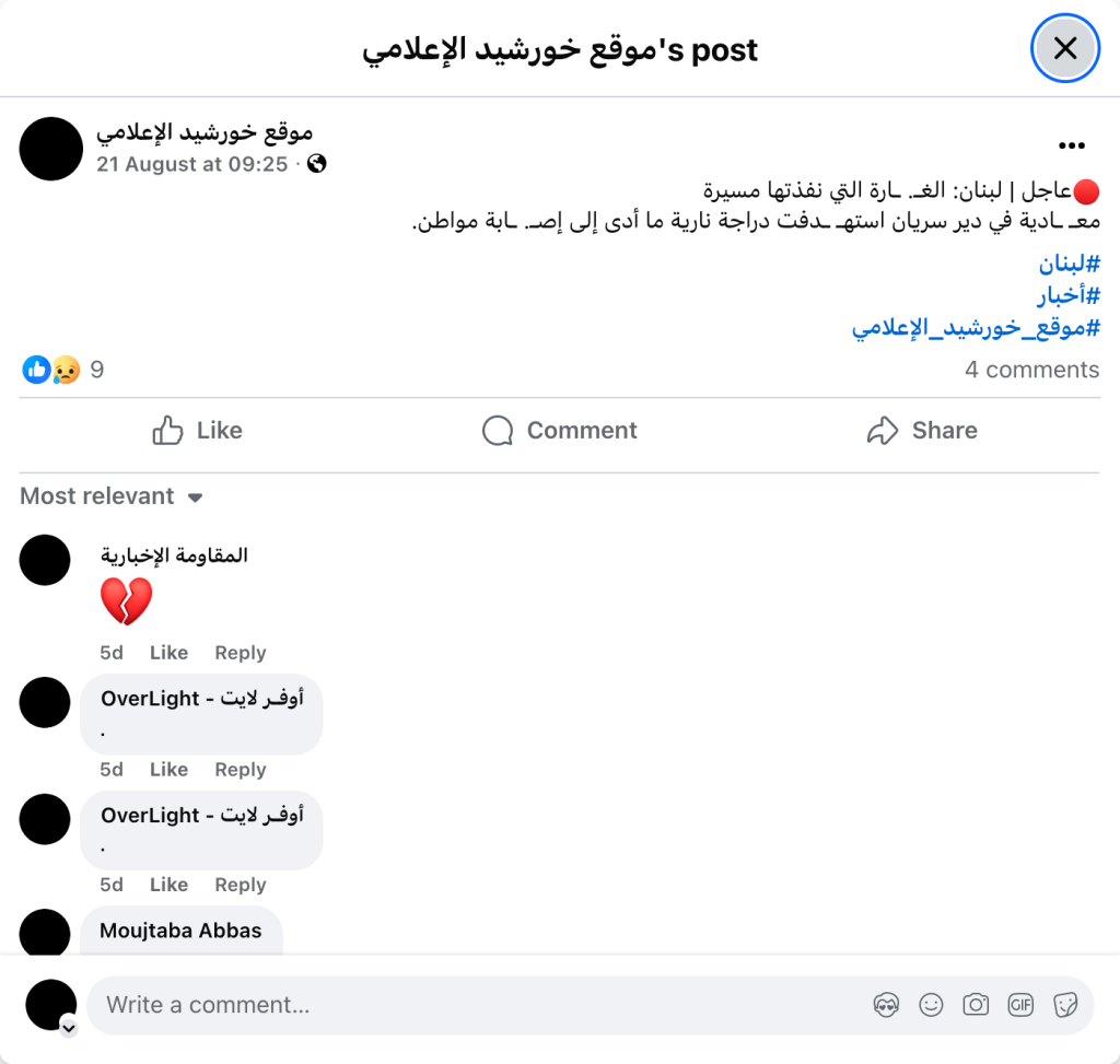 Urgent | Lebanon: The raid carried out by a hostile drone in Deir Siryan targeted a motorcycle, resulting in the injury of a citizen.