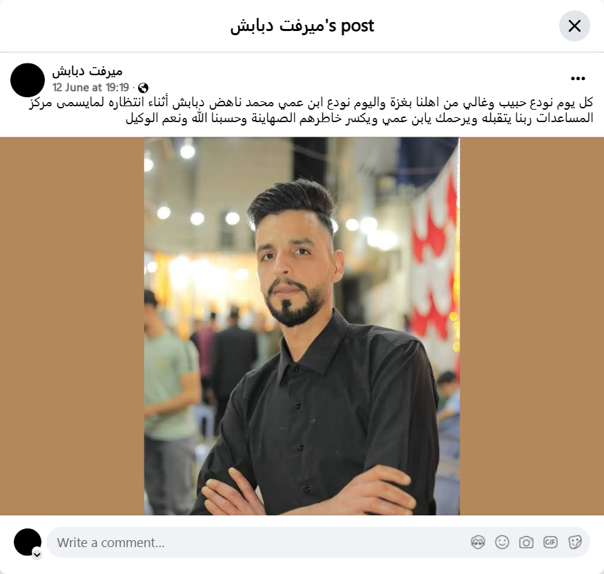 Every day we bid farewell to a dear and beloved person from our people in Gaza, and today we bid farewell to my cousin Mohammed Nahedh Dabbash while he was waiting for the so-called aid center. May God accept him and have mercy on you, my cousin, and break the hearts of the Zionists. God is sufficient for us, and He is the best Disposer of affairs.