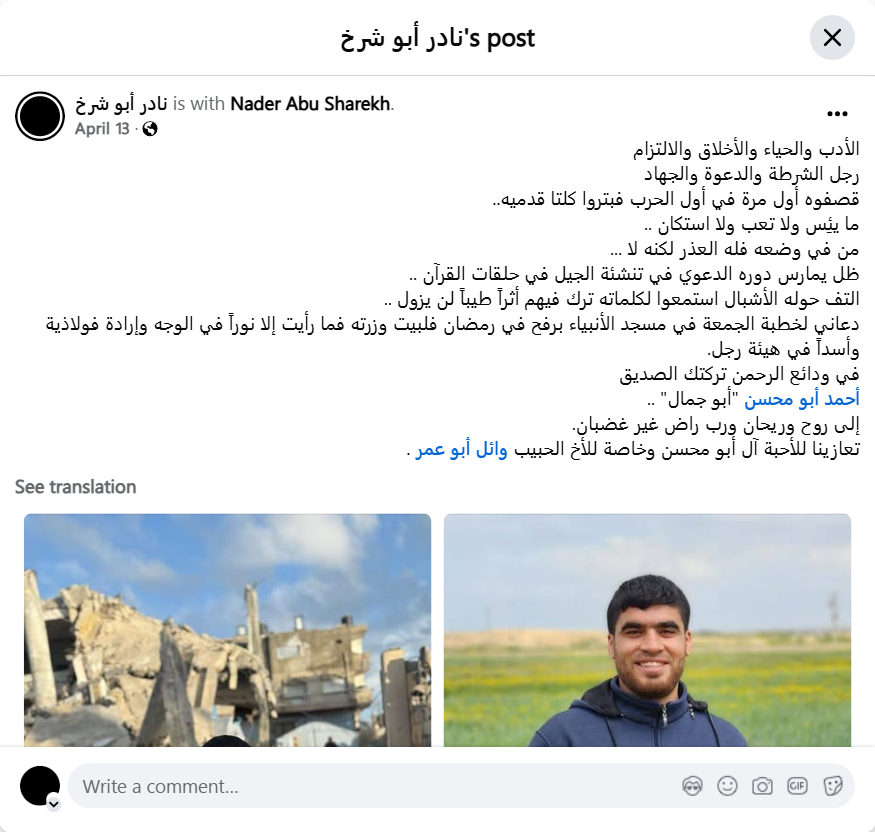 Politeness, modesty, morals, commitment, policeman, preaching and jihad. They bombed him the first time at the beginning of the war and amputated both of his feet.