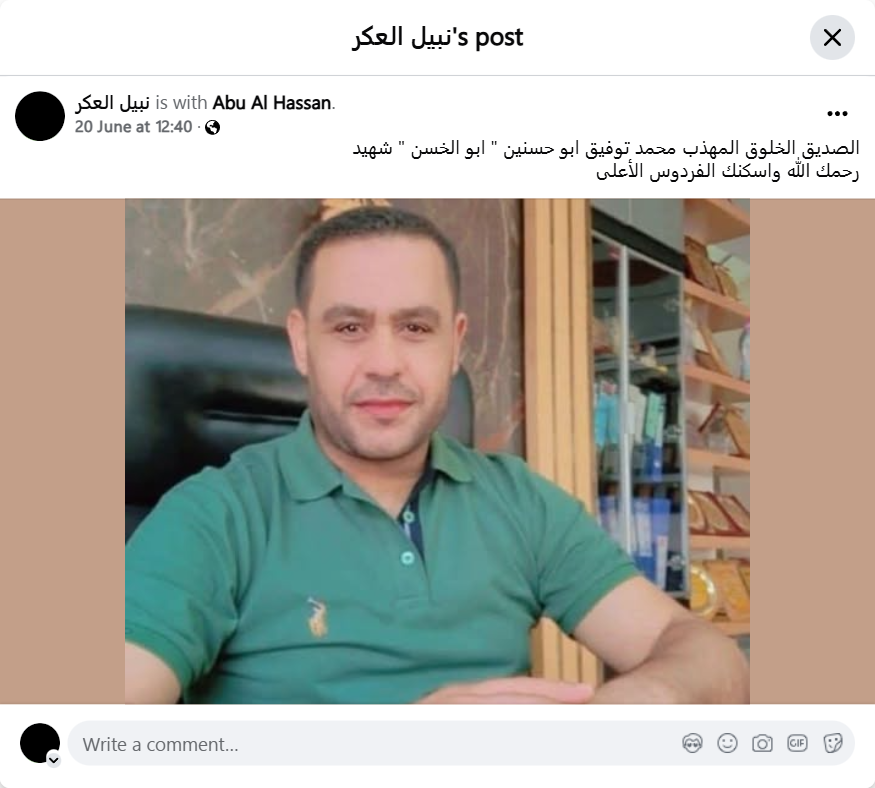 The well-mannered, polite friend, Muhammad Tawfiq Abu Hassanein “Abu Al-Khassan”, a martyr. May God have mercy on you and grant you the highest paradise.