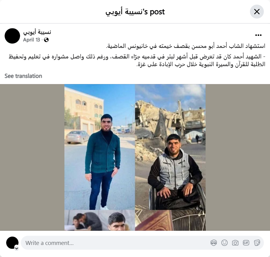 The young man, Ahmed Abu Mohsen, was martyred when his tent was bombed in Khan Yunis last month. Martyr Ahmed had both his feet amputated months earlier as a result of the bombing, yet he continued teaching and memorizing the Quran and the Prophet's biography during the war of extermination on Gaza.