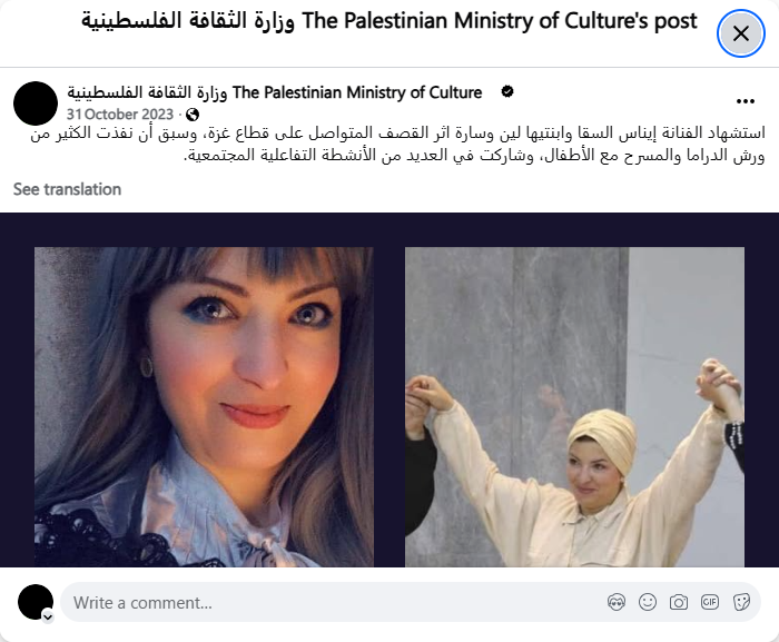 Artist Enas Al-Saqa and her two daughters, Lynn and Sarah, were martyred as a result of the ongoing bombardment of the Gaza Strip. She had previously conducted numerous drama and theater workshops with children and participated in numerous interactive community activities.
