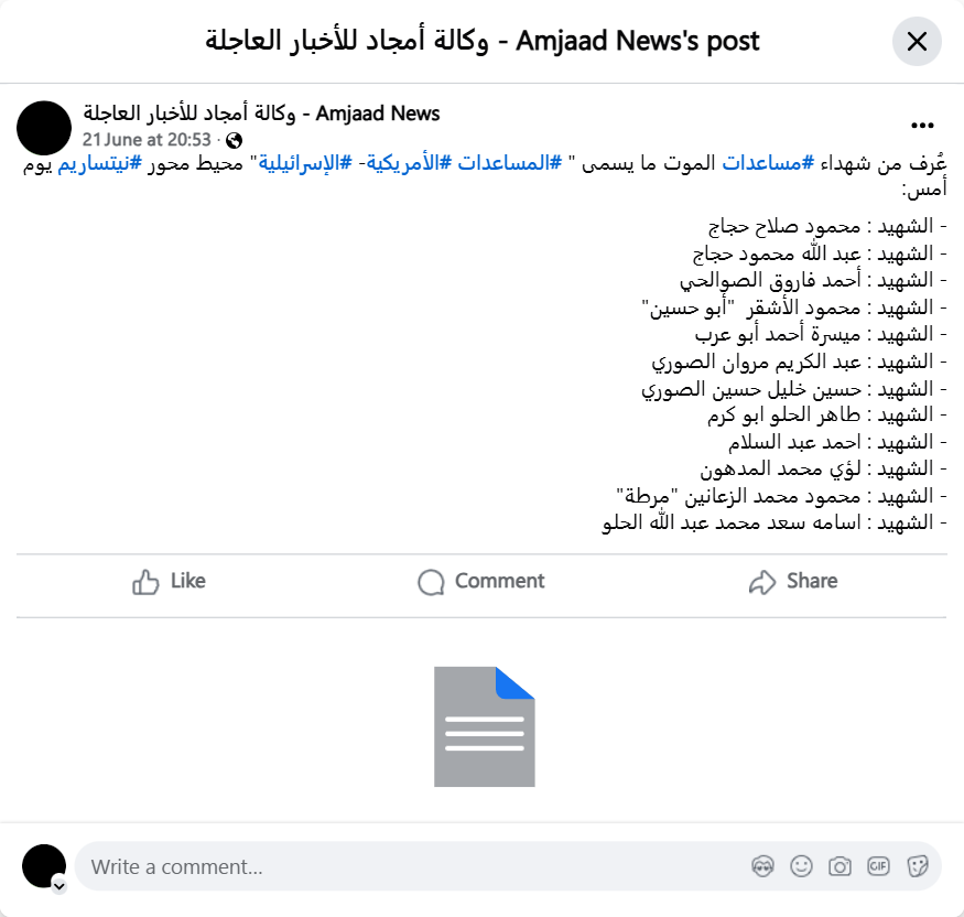 The martyrs of the so-called "American-Israeli aid" in the vicinity of the Netzarim axis yesterday were identified as: - Martyr: Mahmoud Salah Hajjaj - Martyr: Abdullah Mahmoud Hajjaj - Martyr: Ahmed Farouk Al-Sawalihi - Martyr: Mahmoud Al-Ashqar "Abu Hussein" - Martyr: Maysara Ahmed Abu Arab - Martyr: Abdul Karim Marwan Al-Souri - Martyr: Hussein Khalil Hussein Al-Souri - Martyr: Taher Al-Helou Abu Karam - Martyr: Ahmed Abdel Salam - Martyr: Louay Muhammad Al-Madhoun - Martyr: Mahmoud Muhammad Al-Za'anin "Marta" - Martyr: Osama Saad Muhammad Abdullah Al-Helou