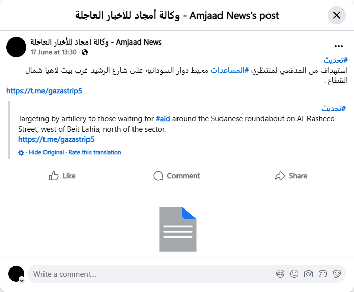 Artillery targeting of people waiting for #aid around the Sudanese roundabout on Rashid Street, west of Beit Lahia, north of the Gaza Strip.