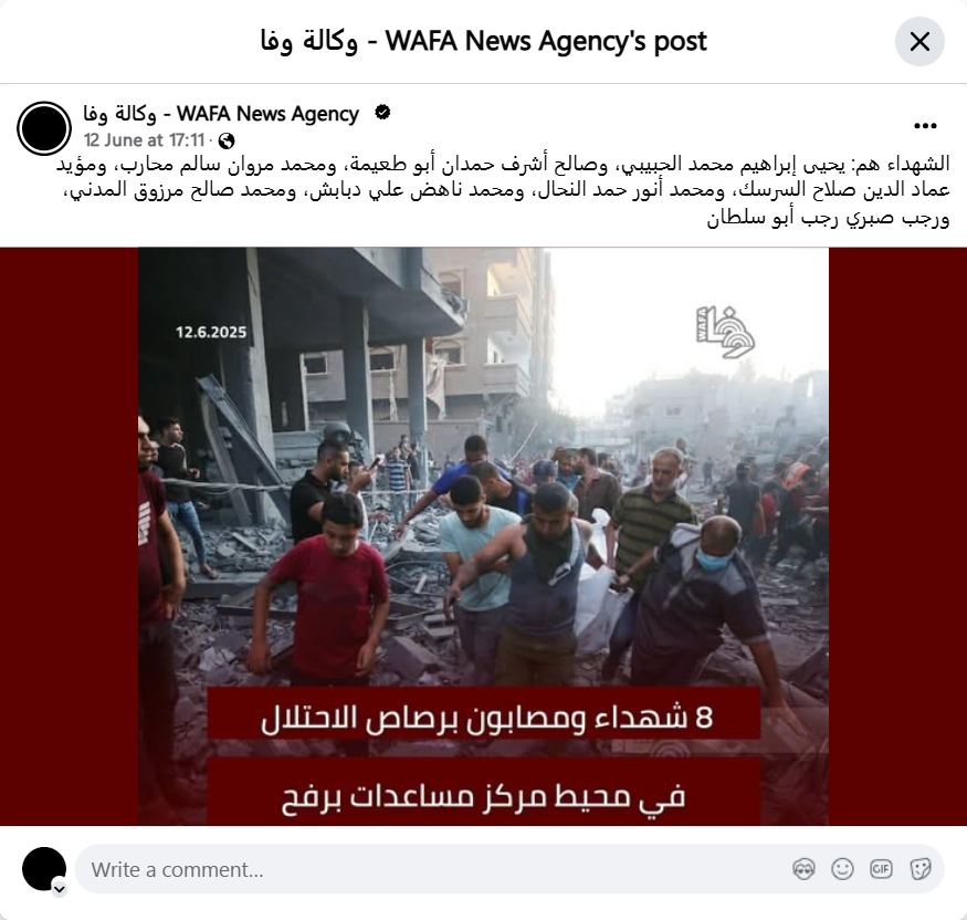 Archive URL: https://airwars.org/source/www-facebook-com-%d9%88%d9%83%d8%a7%d9%84%d8%a9-%d9%88%d9%81%d8%a7-wafa-news-agency-pfbid0wemtgwsab7vdcrw8792qsupyxfzpiqxbu3tsgffvrsjajydrsdc3octcgqwrx77nl-2025-06-12-151100/