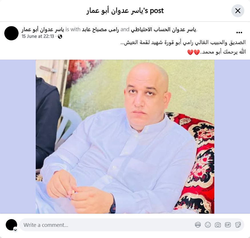 My dear friend and beloved Rami Abu Qura, a martyr for his livelihood... May God have mercy on you, Abu Muhammad.