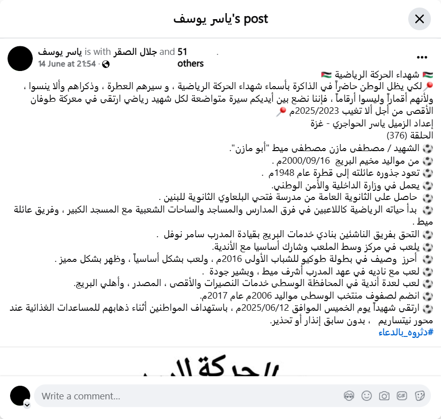 Martyrs of the Sports Movement In order for the homeland to remain present in memory with the names of the martyrs of the sports movement, their fragrant biographies, and their memory, and not to be forgotten, and because they are moons and not numbers, we put in your hands a humble biography of every sports martyr who ascended in the Battle of the Flood of Al-Aqsa, so that they will not be absent 2023/2025 AD Prepared by colleague Yasser Al-Hawajri - Gaza Episode (376) Martyr / Mustafa Mazen Mustafa Mait "Abu Mazen". Born in Al-Bureij Camp on 09/16/2000 AD. His family roots go back to Qatra in 1948 AD. He works in the Ministry of Interior and National Security. He obtained his high school diploma from Fathi Al-Balawi Secondary School for Boys. He began his sports career as a player in school teams, mosques and popular squares with the Grand Mosque, and the Mait family team. He joined the junior team of Al-Bureij Services Club under the leadership of coach Samer Nofal. He plays in the midfield position and participated as a starter with the clubs. He won the runner-up award in the first Tokyo Youth Championship in 2016, and played as a starter, and performed exceptionally. He played with his club during the era of coaches Ashraf Met and Bashir Joda. He played for several clubs in the Central Governorate, including Khedmat Al-Nuseirat, Al-Aqsa, Al-Masdar, and Ahli Al-Bureij. He joined the Central Governorate national team, born in 2006, in 2017. He was martyred on Thursday, June 12, 2025, when citizens were targeted while they were going to get food aid at the Netzarim axis, without prior warning or precaution. #Protect_him_with_prayers