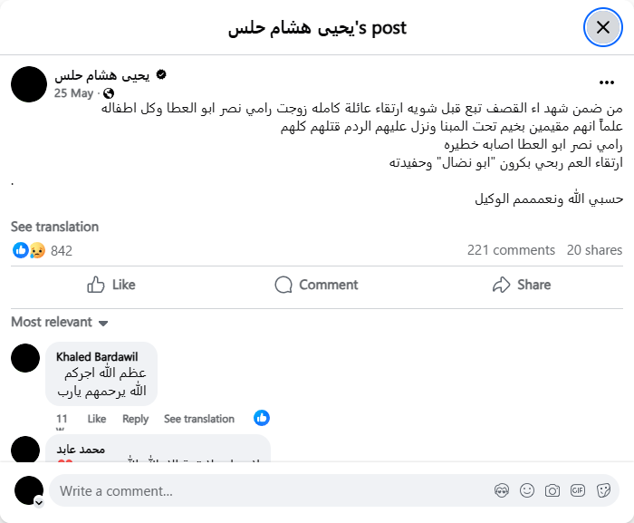 من ضمن شهد اء القصف تبع قبل شويه ارتقاء عائلة كامله زوجت رامي نصر ابو العطا وكل اطفاله