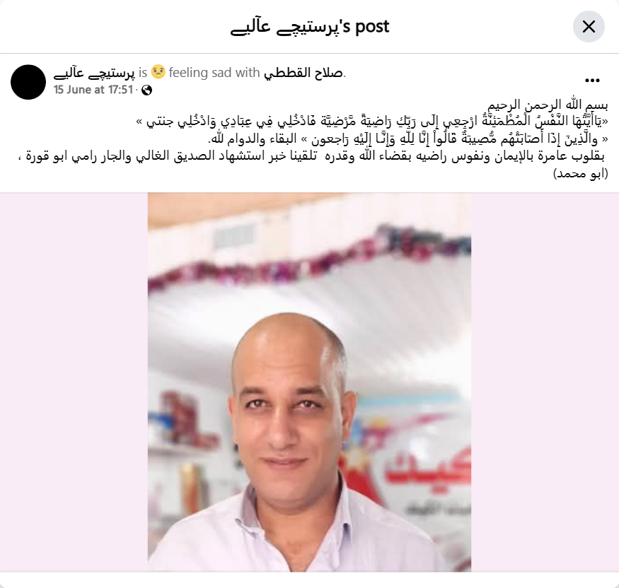 In the name of God, the Most Gracious, the Most Merciful “O reassured soul, return to your Lord, well-pleased and pleasing [to Him], and enter among My servants and enter My Paradise.” “And those who, when disaster strikes them, say, “Indeed we belong to God, and indeed to Him we will return.”” To God belongs permanence and eternity. With hearts filled with faith and souls content with God’s will and destiny, we received the news of the martyrdom of our dear friend and neighbor, Rami Abu Qura (Abu Muhammad).