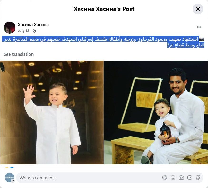 Suhaib Mahmoud Al-Qarinawi, his wife, and children were killed in an Israeli bombing that targeted their tent in the Al-Manasra camp in Deir al-Balah in the central Gaza Strip.