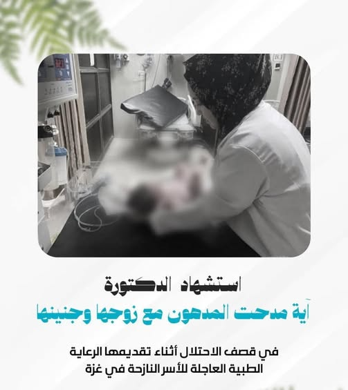 Press coverage: Dr. Aya Madhat Al-Madhoun, along with her husband and unborn child, was killed by Israeli shelling while providing medical care to displaced people in the Gaza Strip.