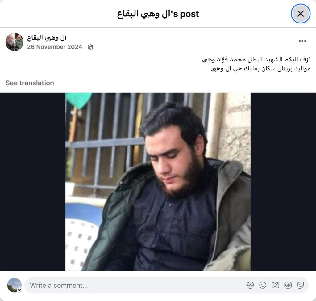 We announce the martyrdom of the hero, Muhammad Fouad Wahbi, born in Brital, resident of Baalbek, Al Wahbi neighborhood.