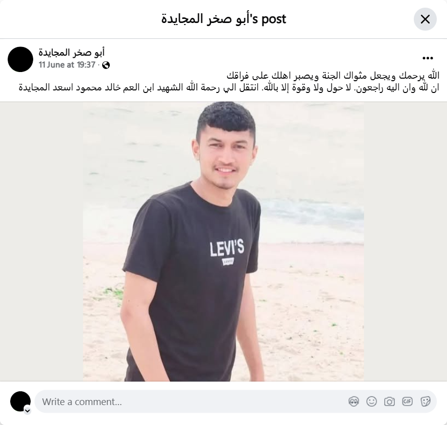 May God have mercy on you and grant you Paradise and give your family patience to bear your loss. To God we belong and to Him we shall return. There is no power or strength except with God. The martyr, our cousin Khaled Mahmoud Asaad Al-Majaydeh, has passed away to the mercy of God.