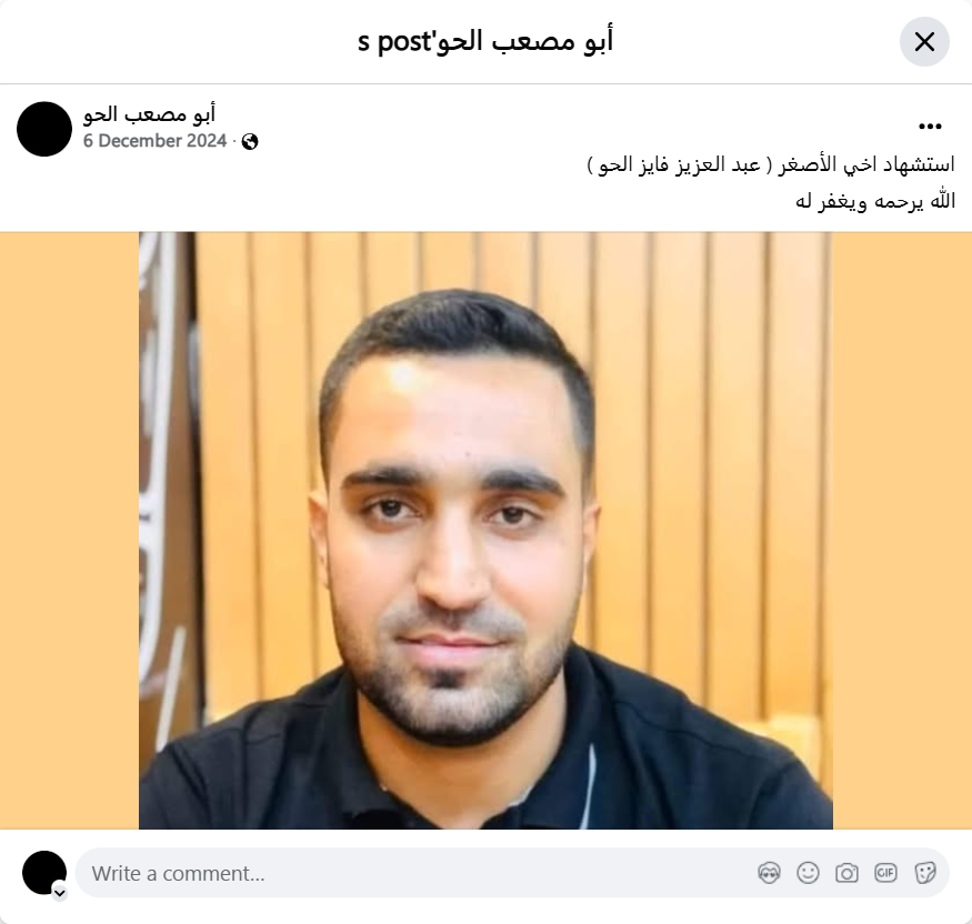 The martyrdom of my younger brother (Abdul Aziz Fayez Al-Haw). May God have mercy on him and forgive him.