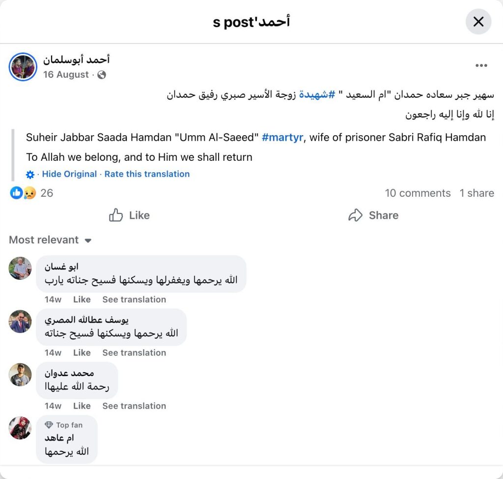 Suheir Jabbar Saada Hamdan "Umm Al-Saeed" #martyr, wife of prisoner Sabri Rafiq Hamdan
