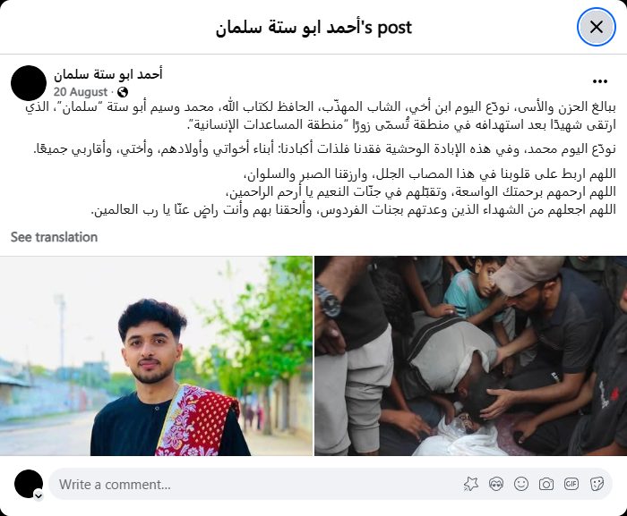 ببالغ الحزن والأسى، نودّع اليوم ابن أخي، الشاب المهذّب، الحافظ لكتاب الله، محمد وسيم أبو ستة “سلمان”، الذي ارتقى شهيدًا بعد استهدافه في منطقة تُسمّى زورًا “منطقة المساعدات الإنسانية”.