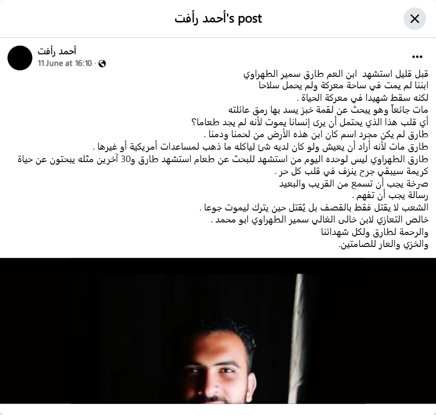 A few moments ago, our cousin Tariq Samir al-Tahrawi was martyred. Our son did not die on a battlefield, nor did he carry a weapon, but he fell as a martyr in the battle of life. He died hungry while searching for a morsel of bread to feed his family. What kind of heart can bear to see a human being die because he could not find food? Tariq was not just a name, he was a son of this land, made of our flesh and blood. Tariq died because he wanted to live, and if he had something to eat, he would not have sought American or other aid. Tariq al-Tahrawi is not the only one who was martyred today searching for food. Tariq and 30 others like him were martyred searching for a dignified life. A wound will remain bleeding in the heart of every free person. A cry that must be heard from near and far. A message that must be understood. People are not only killed by bombing, but they are killed when they are left to die of hunger. My sincere condolences to my dear cousin Samir al-Tahrawi, Abu Muhammad. Mercy to Tariq and to all our martyrs, and shame and disgrace to those who remain silent.