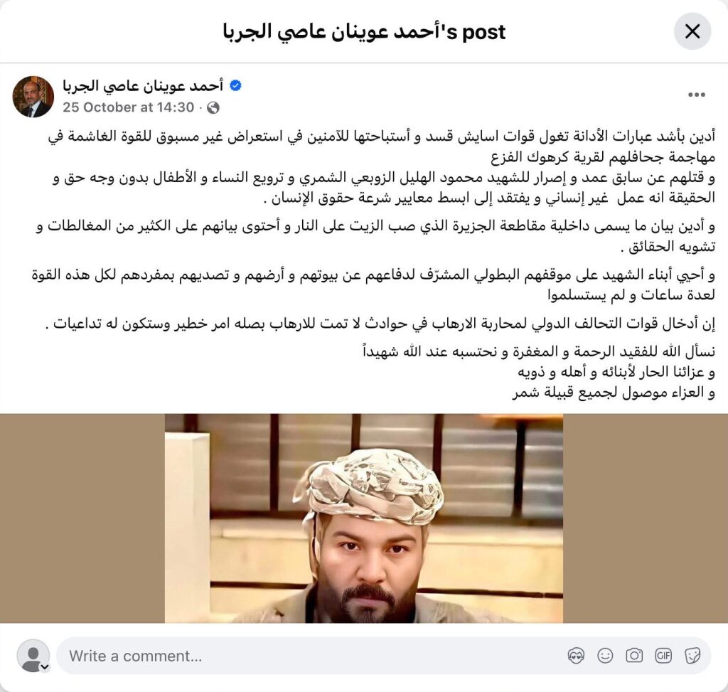 I condemn in the strongest terms the aggression of the SDF Asayish forces and their violation of the sanctity of civilians in an unprecedented display of brutal force when their hordes attacked the village of Karahouk al-Faza'. They deliberately and premeditatedly killed the martyr Mahmoud al-Halil al-Zuba'i al-Shammari and terrorized women and children without any justification. This is truly an inhumane act that violates the most basic standards of human rights.
