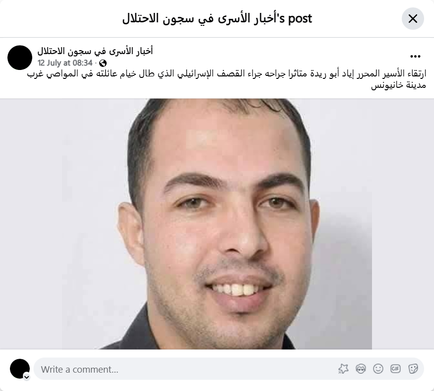 The freed prisoner, Iyad Abu Rida, died of his wounds after being hit by an Israeli bombardment that targeted his family's tents in Al-Mawasi, west of Khan Yunis.