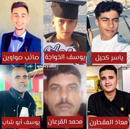 Martyrs killed by the occupation's bullets while trying to obtain aid west of Rafah yesterday: 1. Saeb Hamad Abu Sawawin 2. Yousef Adel Abbas Al-Khawaja 3. Yasser Abdullah Nasr Al-Din Kaheel 4. Yousef Khader Hassan Abu Shab 5. Mohammed Al-Abd Al-Quraan 6. Nawal Khader Abu Shab 7. Iyad Salman Abu Jiab 8. Moaz Mahmoud Al-Maqtran