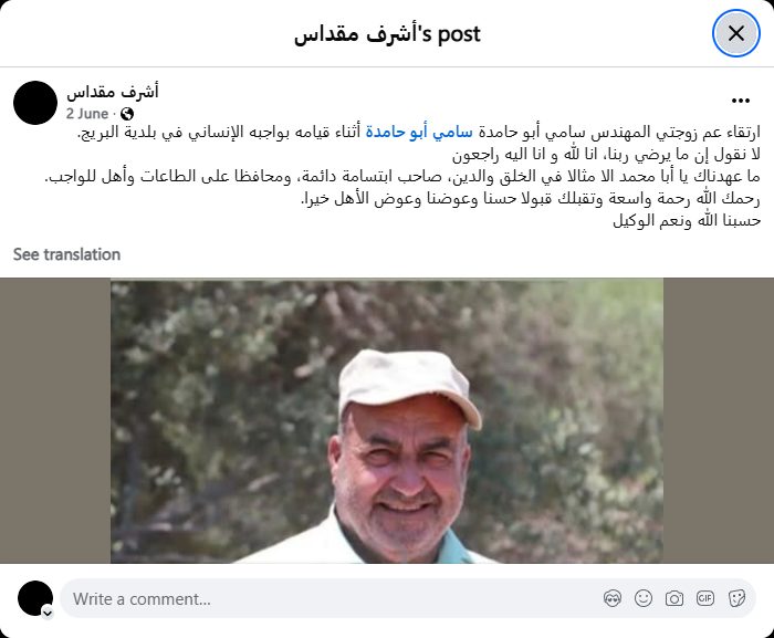 My wife's uncle, Engineer Sami Abu Hamida, passed away while performing his humanitarian duty in the Bureij Municipality.