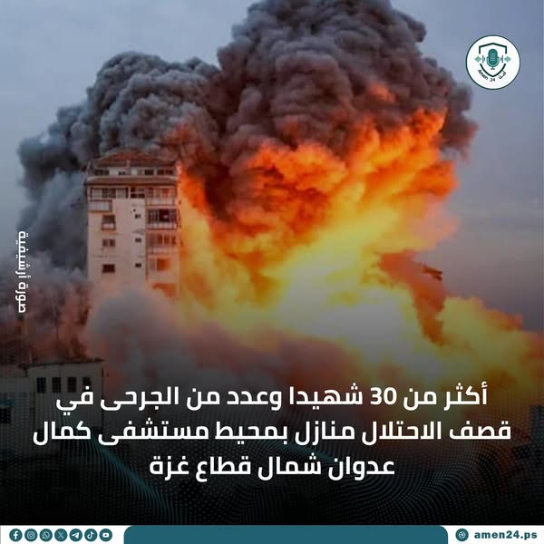 More than 30 martyrs and a number of wounded in the occupation's bombing of houses near Kamal Adwan Hospital in the northern Gaza Strip. #Security24 #PalestineUnitesUs
