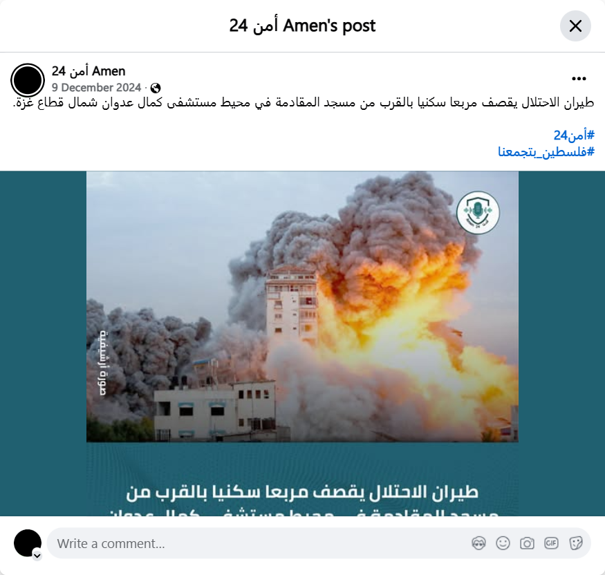 Archive URL: https://airwars.org/source/www-facebook-com-%d8%a3%d9%85%d9%86-24-amen-pfbid0fumnfb9k6fwib4upw8yq5pysggfbyp4hyzvimwy7xr9kv3jyb42nz5mev6tvef2il-2024-12-09-110000/