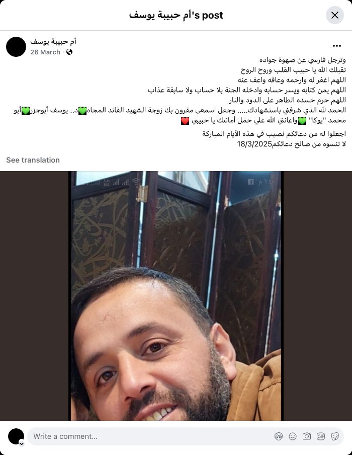 Praise be to God, who honored me with your martyrdom... and made my hearing connected to you. Wife of the martyred, struggling commander, Dr. Yousef Abu Jazar