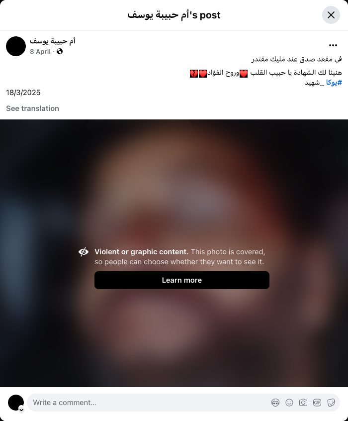 Archive URL: https://airwars.org/source/www-facebook-com-%d8%a3%d9%85-%d8%ad%d8%a8%d9%8a%d8%a8%d8%a9-%d9%8a%d9%88%d8%b3%d9%81-pfbid0oca8p1ktyfgnmdzfxse2vt9qqhwhfd61ai4uvyaslkcynyujw6khiigkgyiee3udl-2026-04-08-110000/