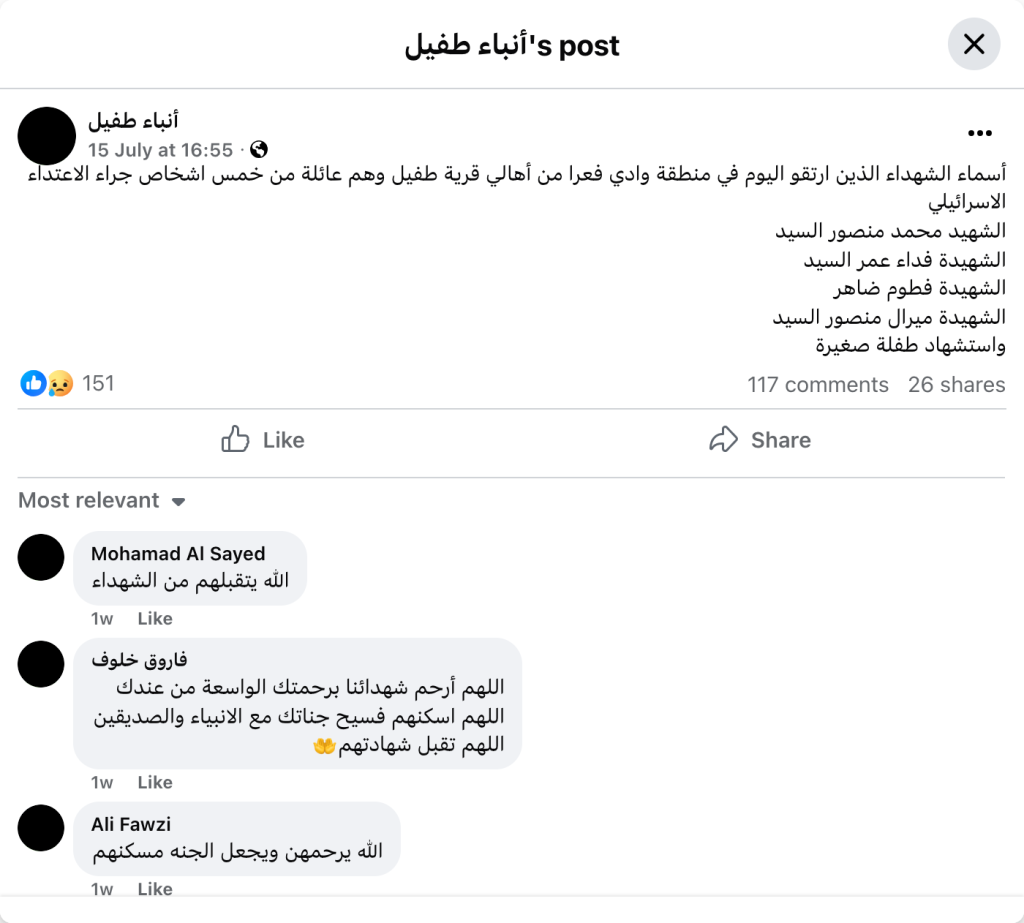 أسماء الشهداء الذين ارتقو اليوم في منطقة وادي فعرا من أهالي قرية طفيل وهم عائلة من خمس اشخاص جراء الاعتداء الاسرائيلي الشهيد محمد منصور السيد الشهيدة فداء عمر السيدالشهيدة فطوم ضاهر الشهيدة ميرال منصور السيد واستشهاد طفلة صغيرة