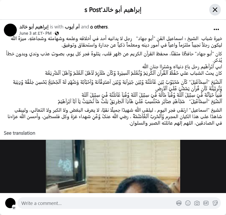 The best of the Sheikh's youth; Ismail Al-Qan "Abu Jihad", a man unmatched in his morals, knowledge, chivalry and courage. God distinguished him to be a noble, committed man, aware of his religion and a smart teacher, worthy, deserving and successful. "Abu Jihad" was a skilled memorizer, who had memorized the Holy Quran by heart, reciting it every day at dawn, in a sweet, melodious voice and without a single noteworthy mistake. My father Ibrahim passed away, he sold his worldly life and bought the paradise of Allah. He used to urge young people to memorize the Holy Quran and learn the Seerah (biography). He was a constant companion of the people of knowledge and the people of Sharia. Sheikh "Ismail" was beloved among his family, his neighbors, his friends and his loved ones, and everyone bore witness to his good character and religion. His upbringing was like a walking Quran on earth. He spent his life in the path of Allah, he spent his money in the path of Allah, and he and his family spent it in the path of Allah. Sheikh "Ismail" is a patient, steadfast fighter. On this path, you got what you wished for, O Abu Ibrahim. Sheikh "Ismail" ascended at dawn today, to meet Allah as a beautiful, pure martyr, who did not know hatred. Neither arrogance nor haughtiness, and let it remain a witness to this criminal entity and the brutal war. May God be pleased with you and with the martyrs of Gaza and all of Palestine, and may God grant us good consolation for the truthful ones. O God, grant his family patience and solace.