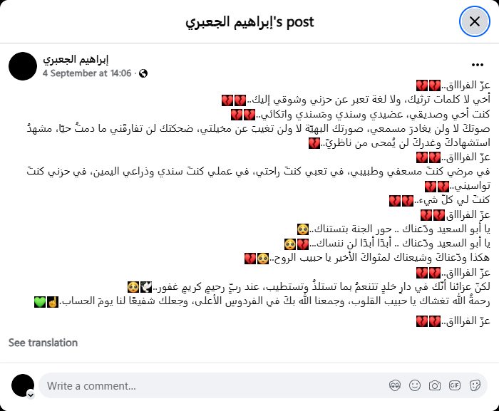 صوتكَ لا ولن يغادرَ مسمعي، صورتك البهيّة لا ولن تغيبَ عن مخيلتي، ضحكتك لن تفارقَني ما دمتُ حيّا، مشهدُ استشهادكَ وغدركَ لن يُمحى من ناظريّ..