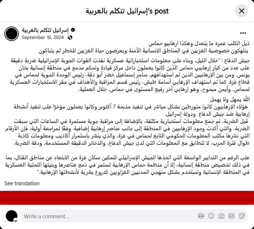على الرغم من التدابير الواسعة التي اتخذها الجيش الإسرائيلي لتمكين سكان غزة من الابتعاد عن مناطق القتال، بما في ذلك تخصيص منطقة إنسانية، إلا أن منظمة حماس الإرهابية تستمر في دمج عناصرها وبنيتها التحتية العسكرية في المنطقة الإنسانية وتستخدم بشكل منهجي المدنيين الغزاويين كدروع بشرية لأنشطتها الإرهابية."