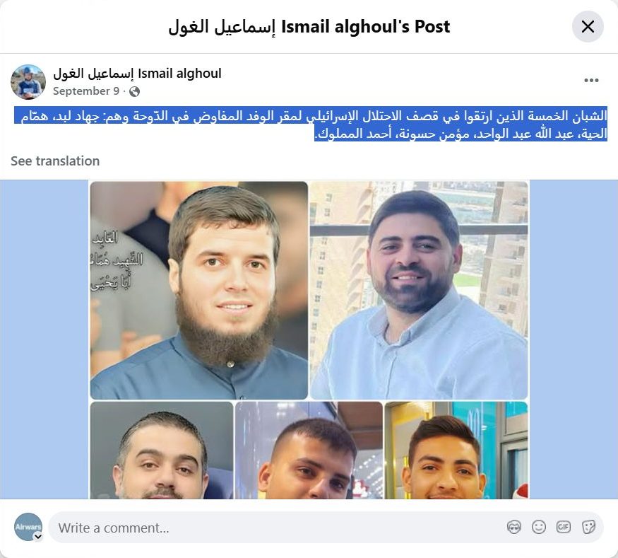 الشبان الخمسة الذين ارتقوا في قصف الاحتلال الإسرائيلي لمقر الوفد المفاوض في الدّوحة وهم: جهاد لبد، همّام الحية، عبد الله عبد الواحد، مؤمن حسونة، أحمد المملوك.