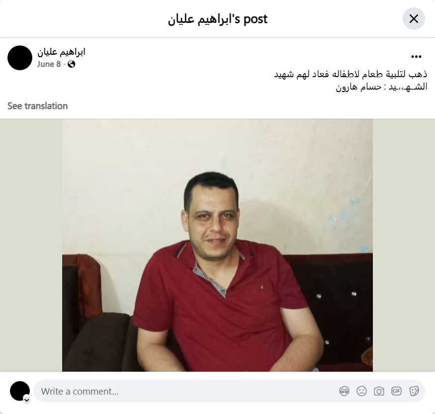 He went to get food for his children and returned to them a martyr. The martyr: Hossam Haroun