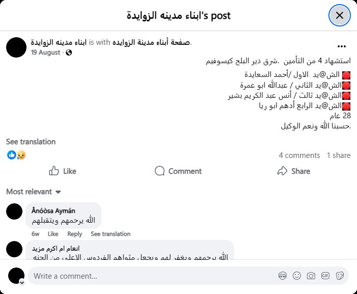 Martyrdom of 4 insurance workers. East of Deir al-Balah, Kissufim