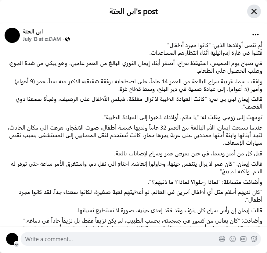 عندما سمعت إيمان، الأم البالغة من العمر 32 عاماً ولديها خمسة أطفال، صوت الانفجار، هرعت إلى مكان الحادث، لتجد أبنائها وابنة أختها ممددين على عربة يجرها حمار، كانت تُستخدم لنقل المصابين إلى المستشفى بسبب نقص سيارات الإسعاف.
