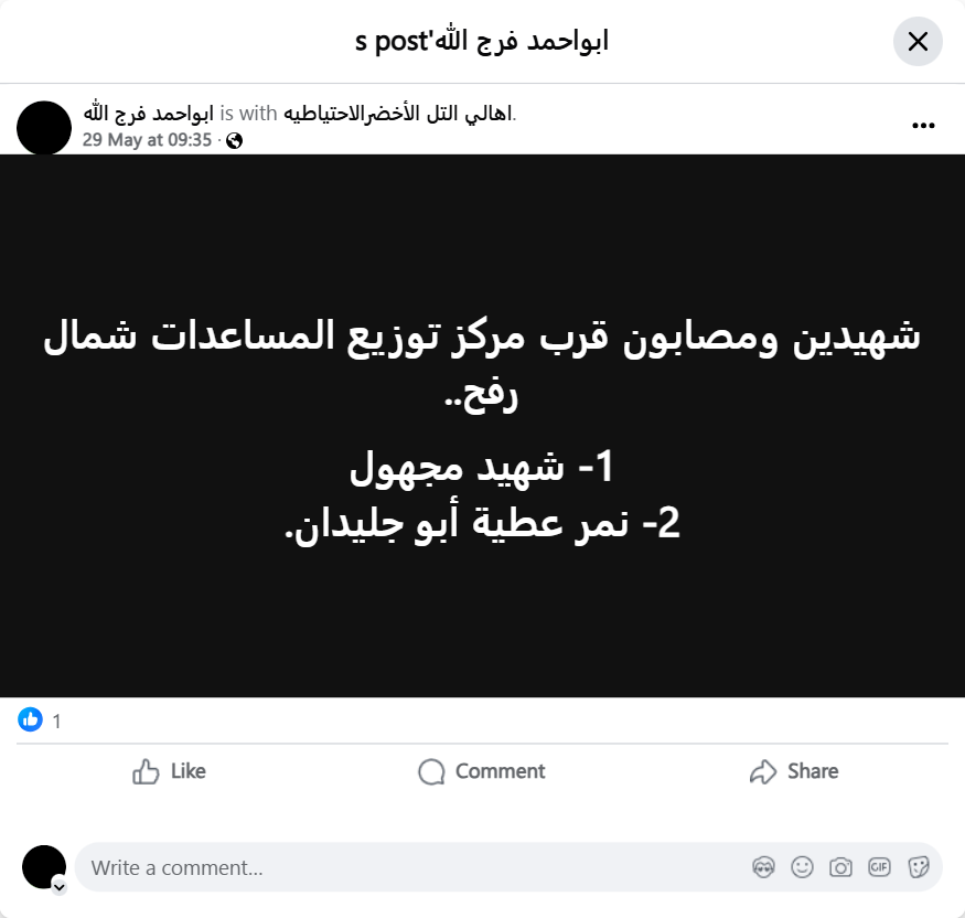 شهيدين ومصابون قرب مركز توزيع المساعدات شمال رفح..1- شهيد مجهول 2- نمر عطية أبو جليدان.شهيدين ومصابون قرب مركز توزيع المساعدات شمال رفح..1- شهيد مجهول 2- نمر عطية أبو جليدان.