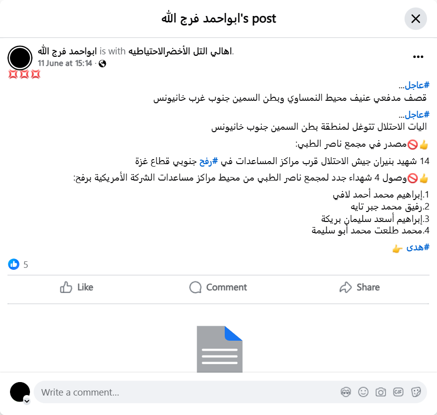 A source in Nasser Medical Complex: 14 martyrs by the fire of the occupation army near the aid centers in #Rafah, south of the Gaza Strip. 4 new martyrs arrived at Nasser Medical Complex from the vicinity of the American company's aid centers in Rafah: 1. Ibrahim Muhammad Ahmad Lafi 2. Rafiq Muhammad Jabr Tayeh 3. Ibrahim Asaad Suleiman Brika 4. Muhammad Talat Muhammad Abu Sulayma