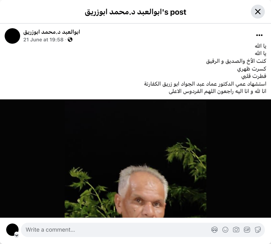 Oh God, oh God, you were a brother, a friend, and a companion. You broke my back and shattered my heart. The martyrdom of my uncle, Dr. Imad Abdul Jawad Abu Zureiq Al-Kafarneh. To God we belong and to Him we shall return. Oh God, the highest paradise.